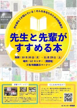 センター長や各学科の図書委員の先生とLCセンターの学生ボランティア「ライブラリーサポーター」からのおすすめ本を展示します。