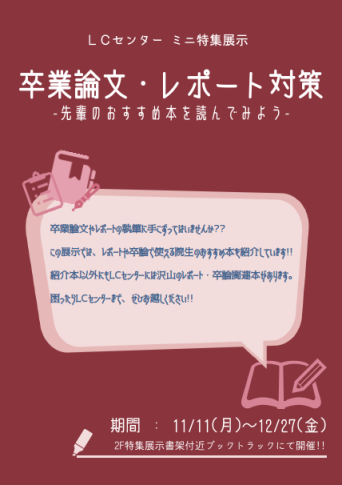 LCセンターのアルバイト院生17名が、学生目線でレポートや卒業論文の執筆時に役立つ本を選びました。卒論やレポート作成に役立つアドバイスや注意事項等のPOPにも注目です。