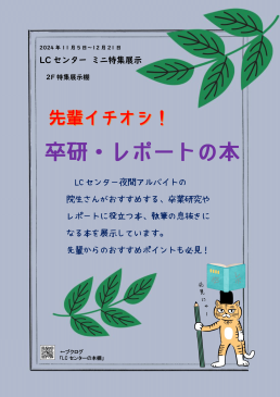 図書館の夜間アルバイトの院生さんたちがおすすめする、卒研やレポートに関する本を展示しています。