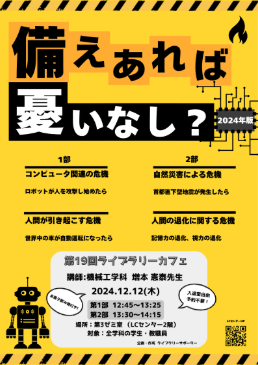 今回は、機械工学科の増本先生をお招きし、自然災害による(首都直下型地震が発生したら)やコンピュータ関連による危機(ロボットが人を攻撃し始めたら)など将来起こり得る様々な危機的状況の例を示しながら、どのように状況を改善できるか、いまのうちにどんなものづくりをしていけば良さそうか、参加者の皆さんと考えていきます。